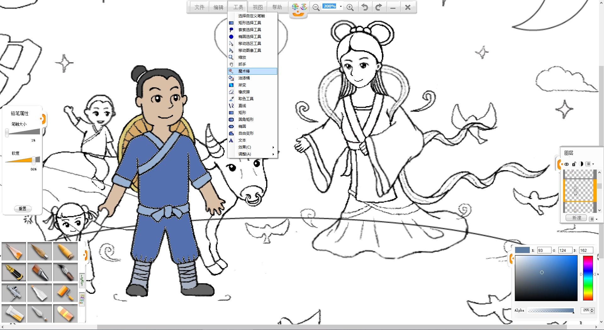 11.使用魔术棒工具选择闭合区域后,使用油漆桶工具为牛郎铺底色。
