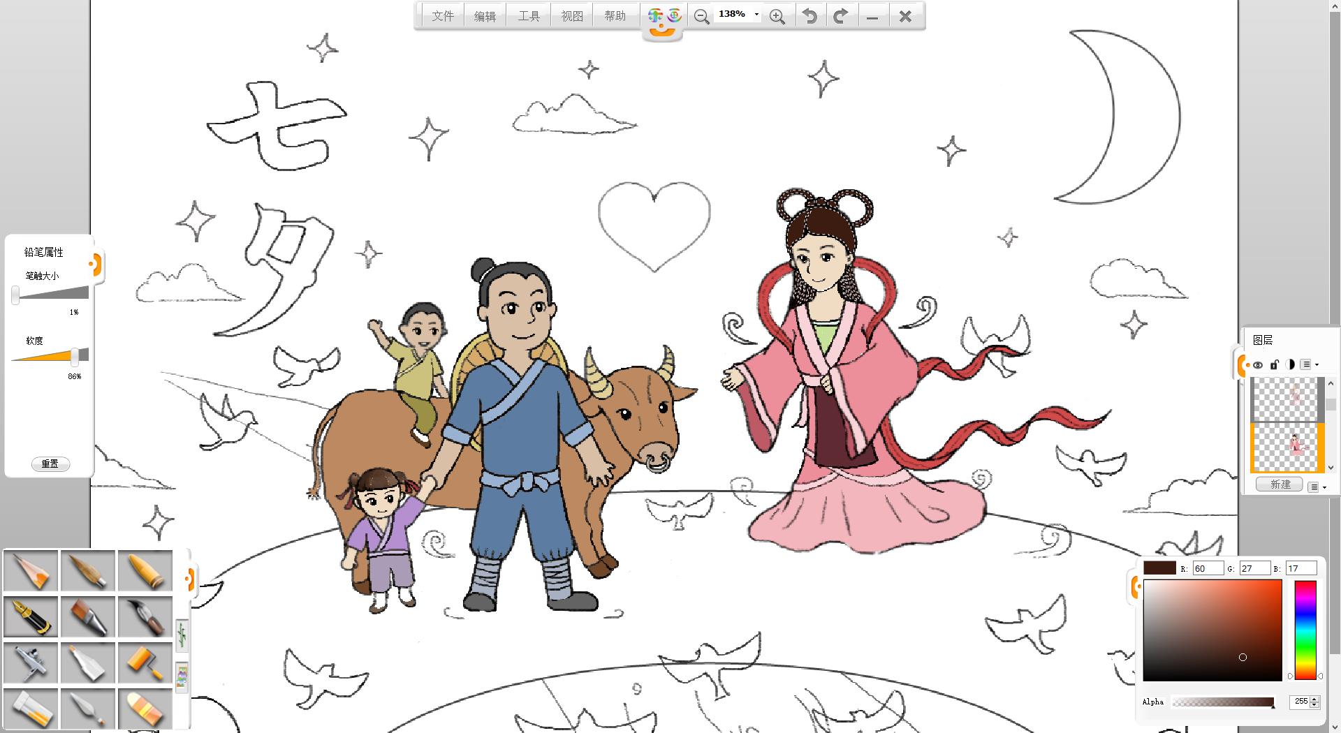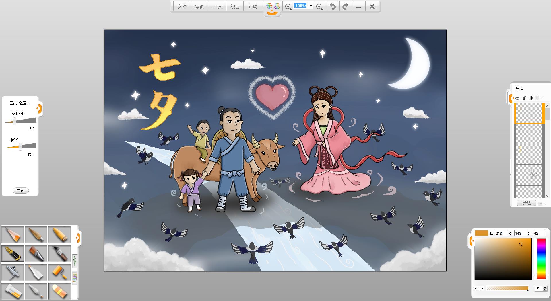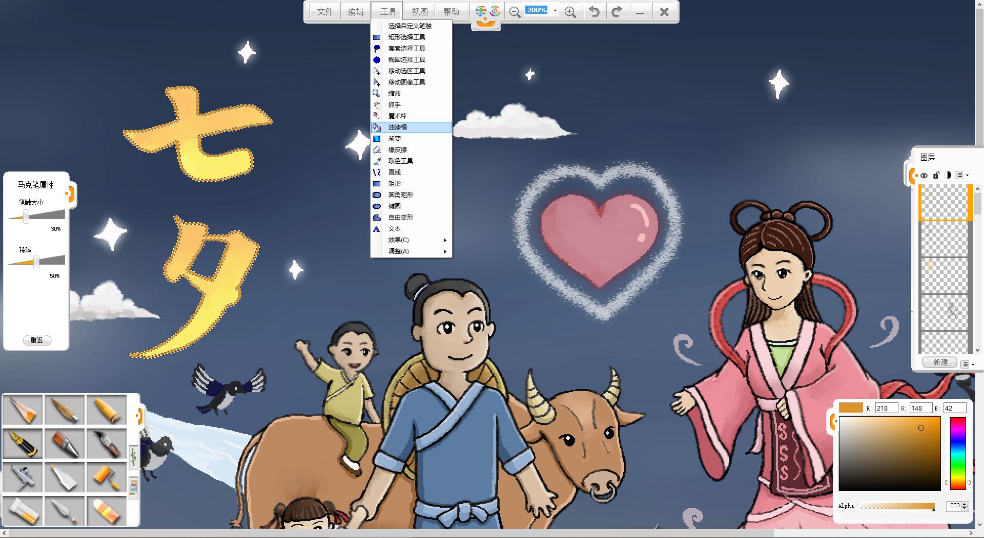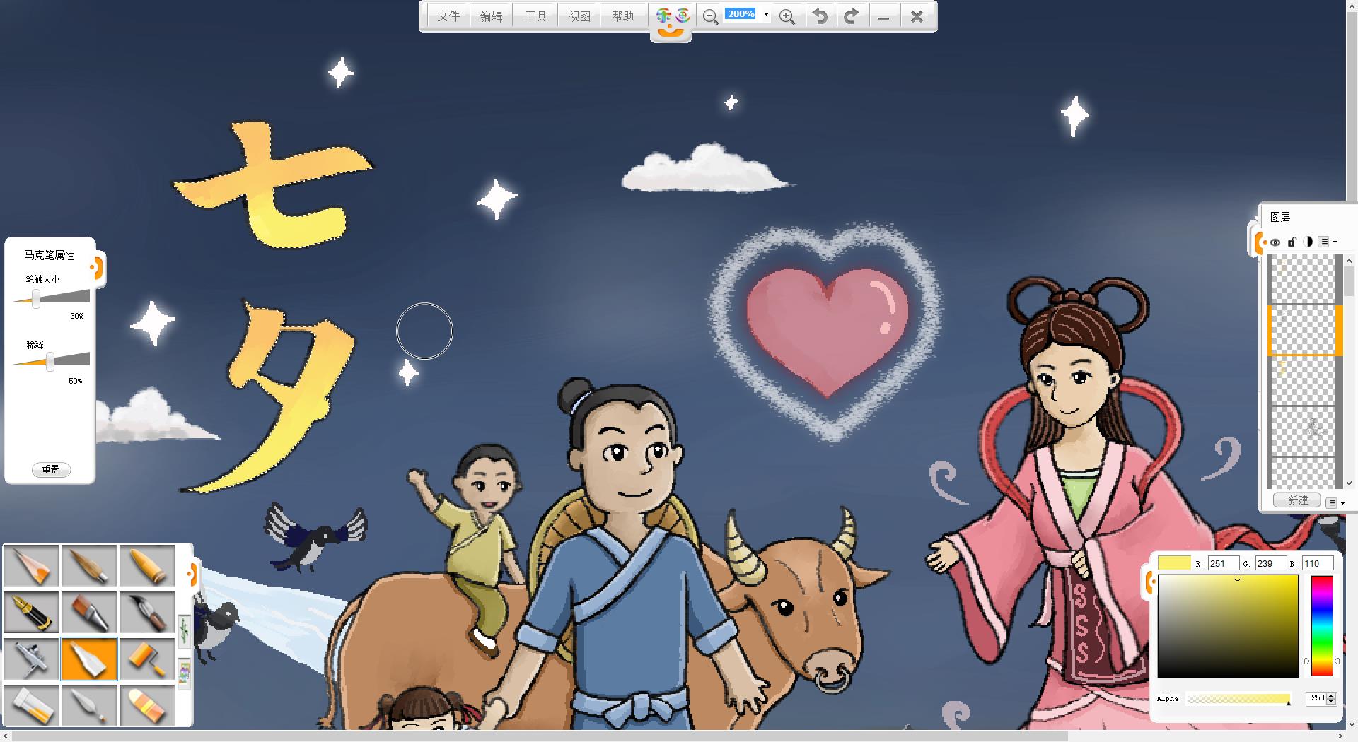 9.使用铅笔笔触在画面左上方书写“七夕”两个字。