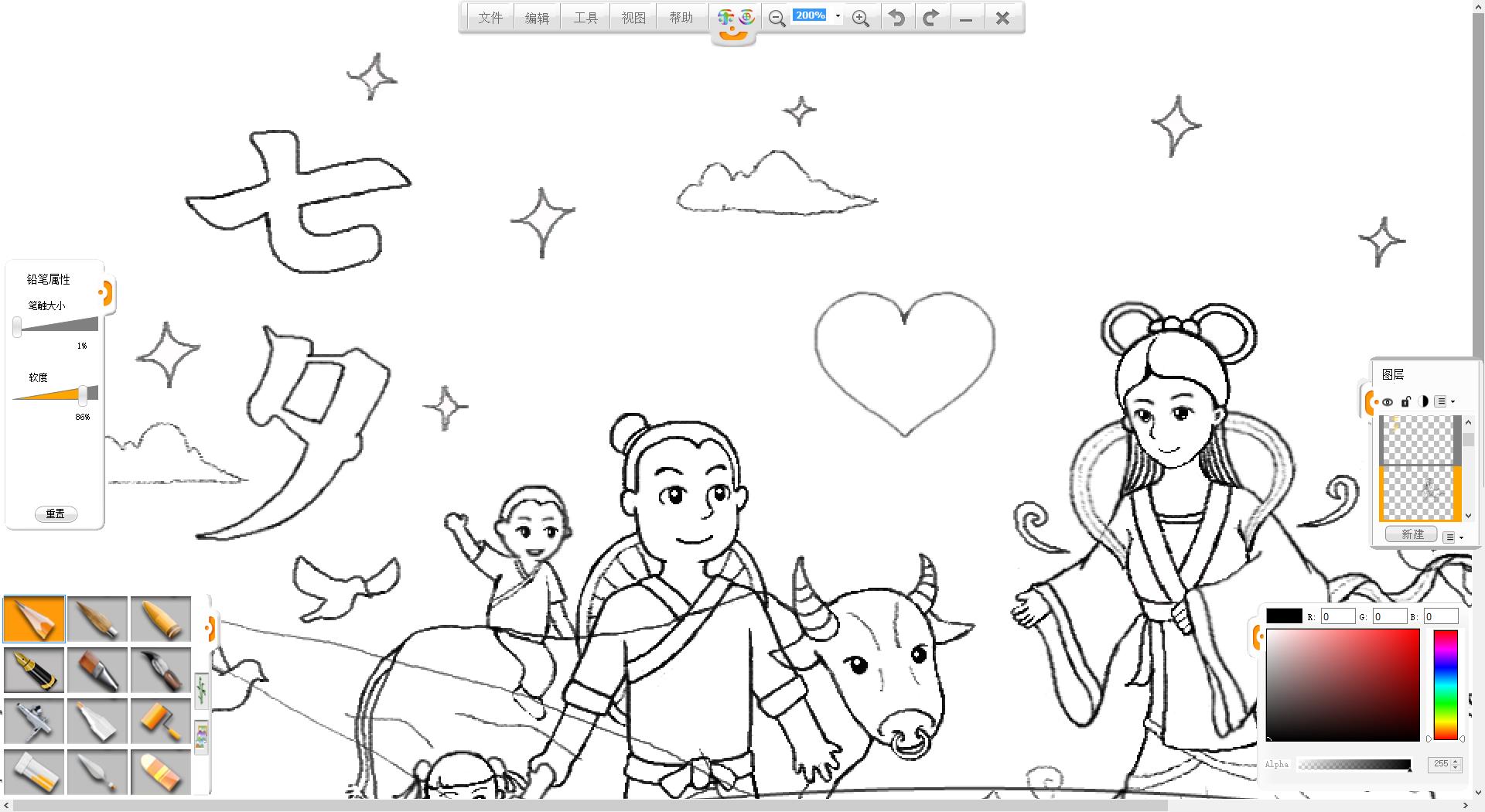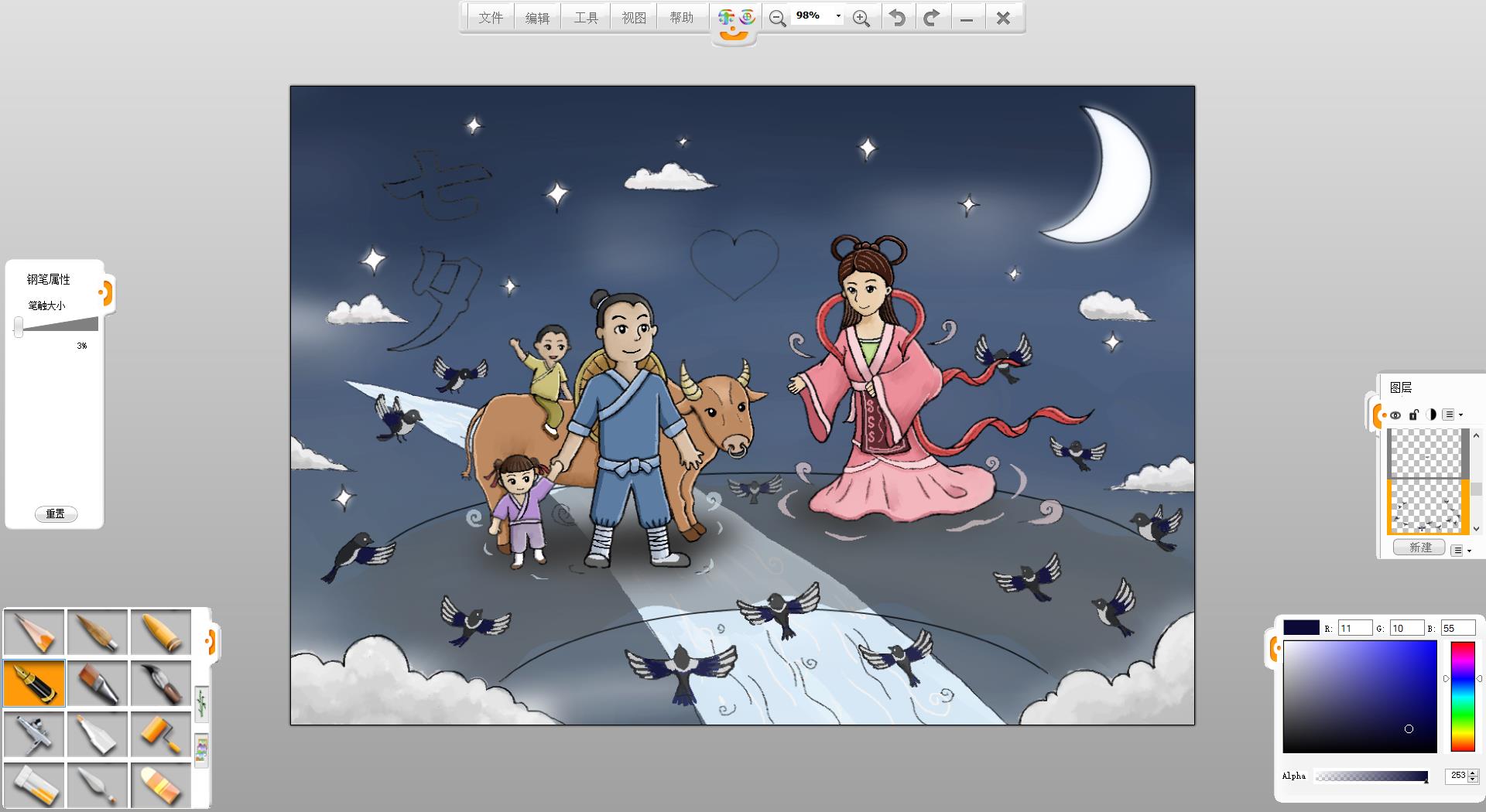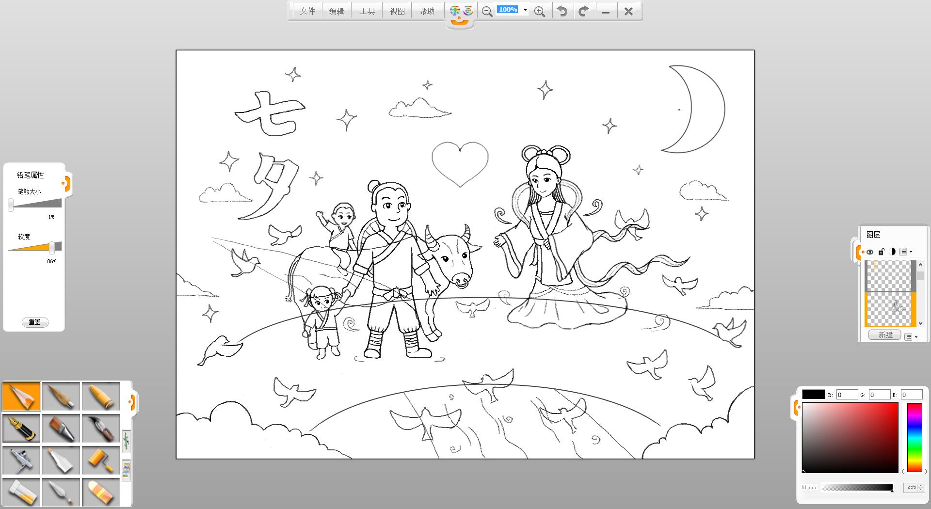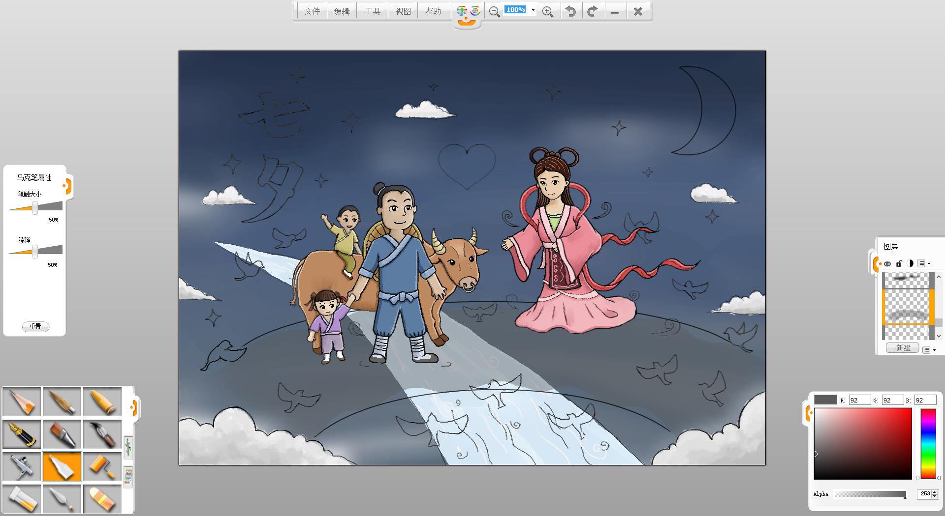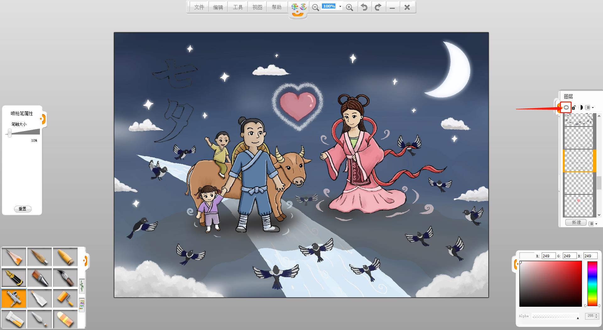 9.使用铅笔笔触在画面左上方书写“七夕”两个字。