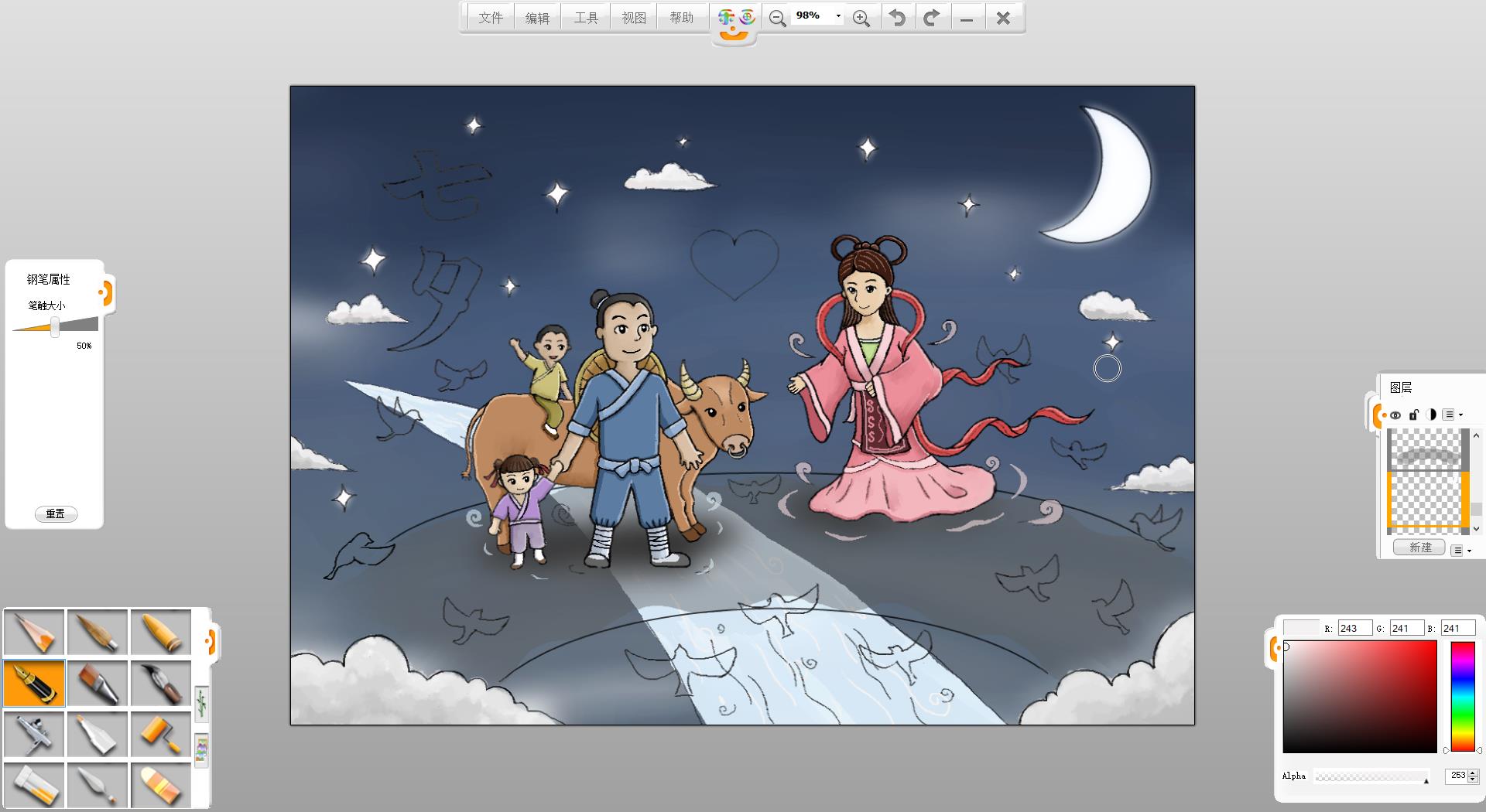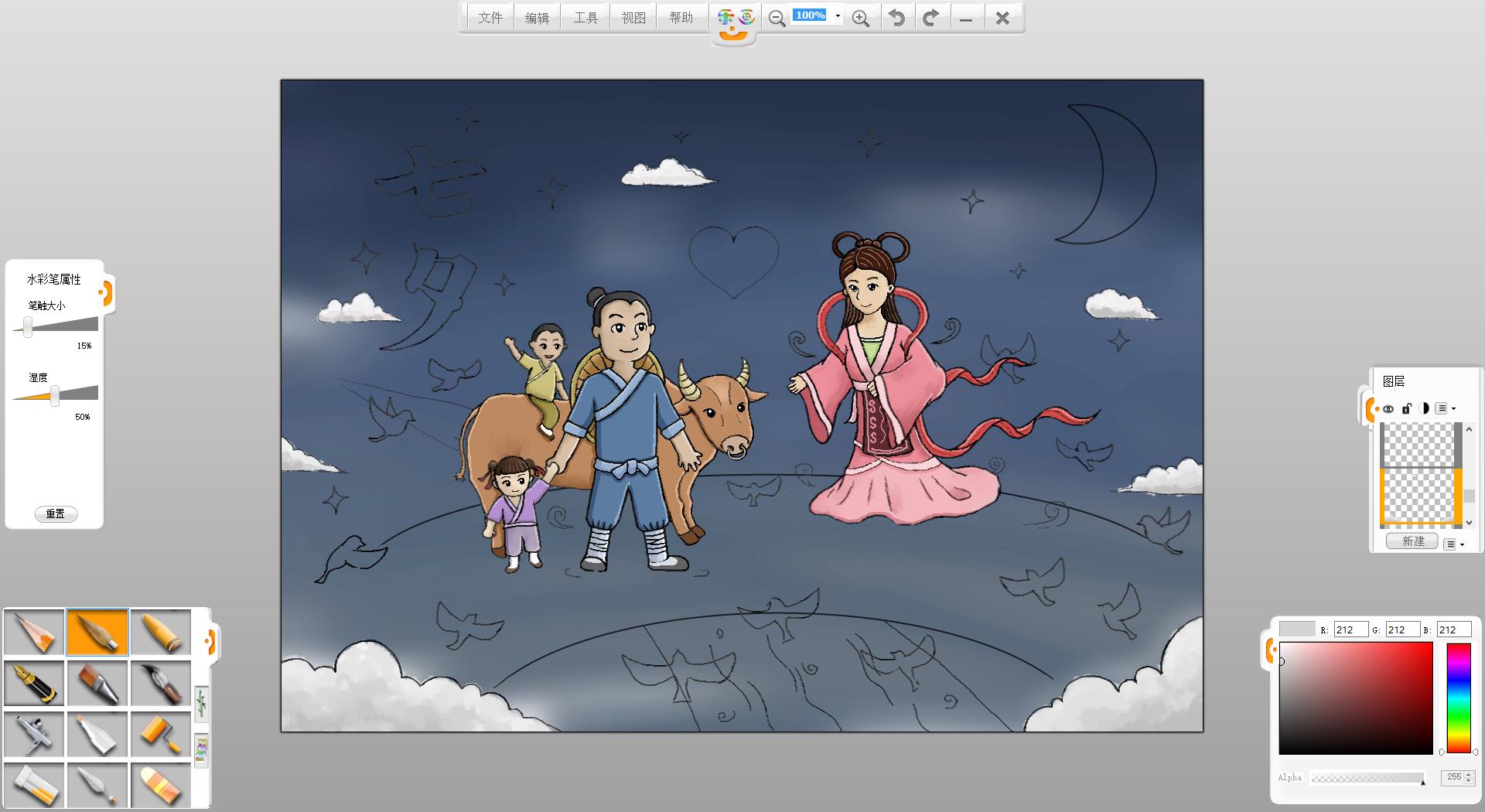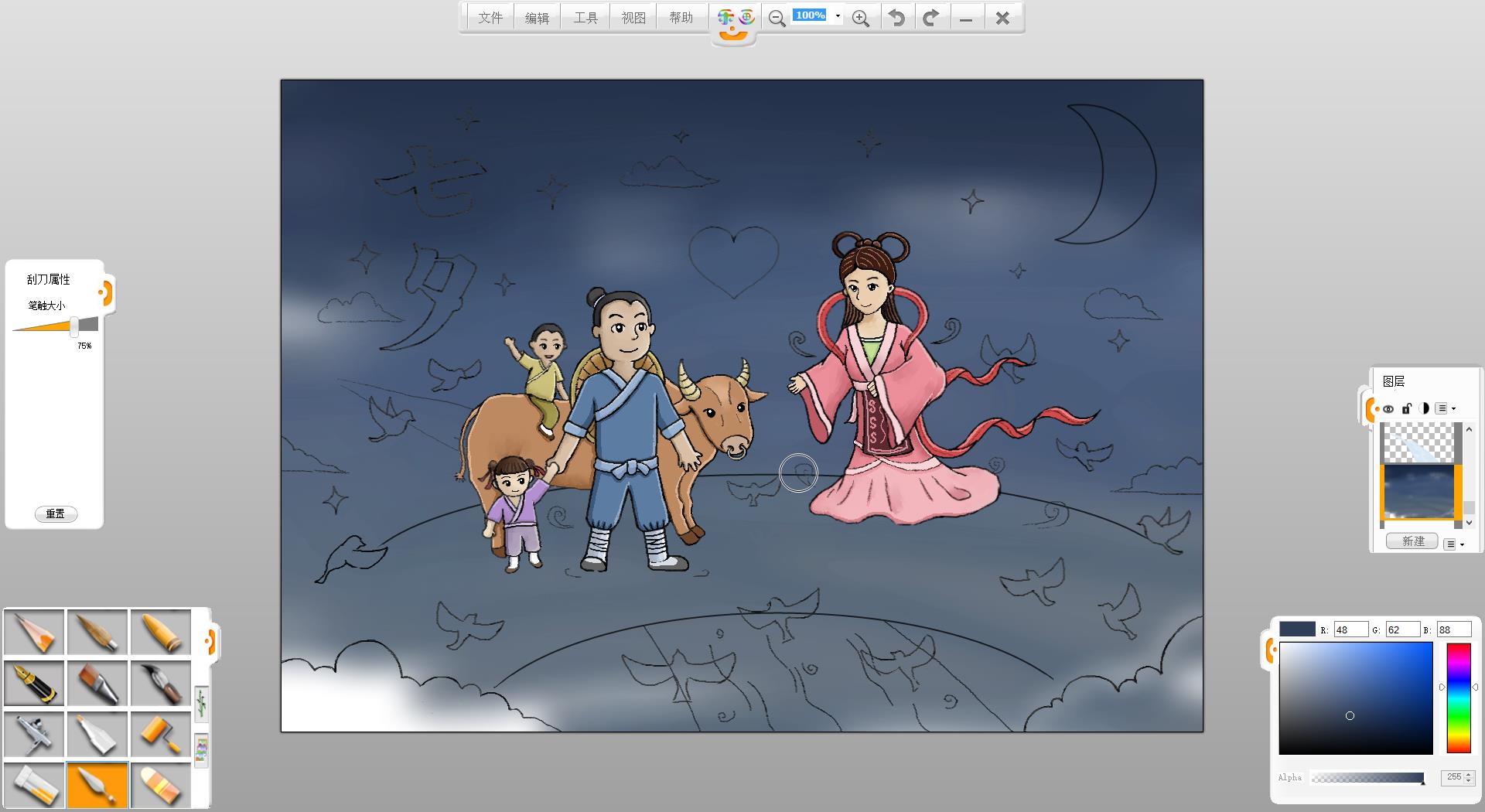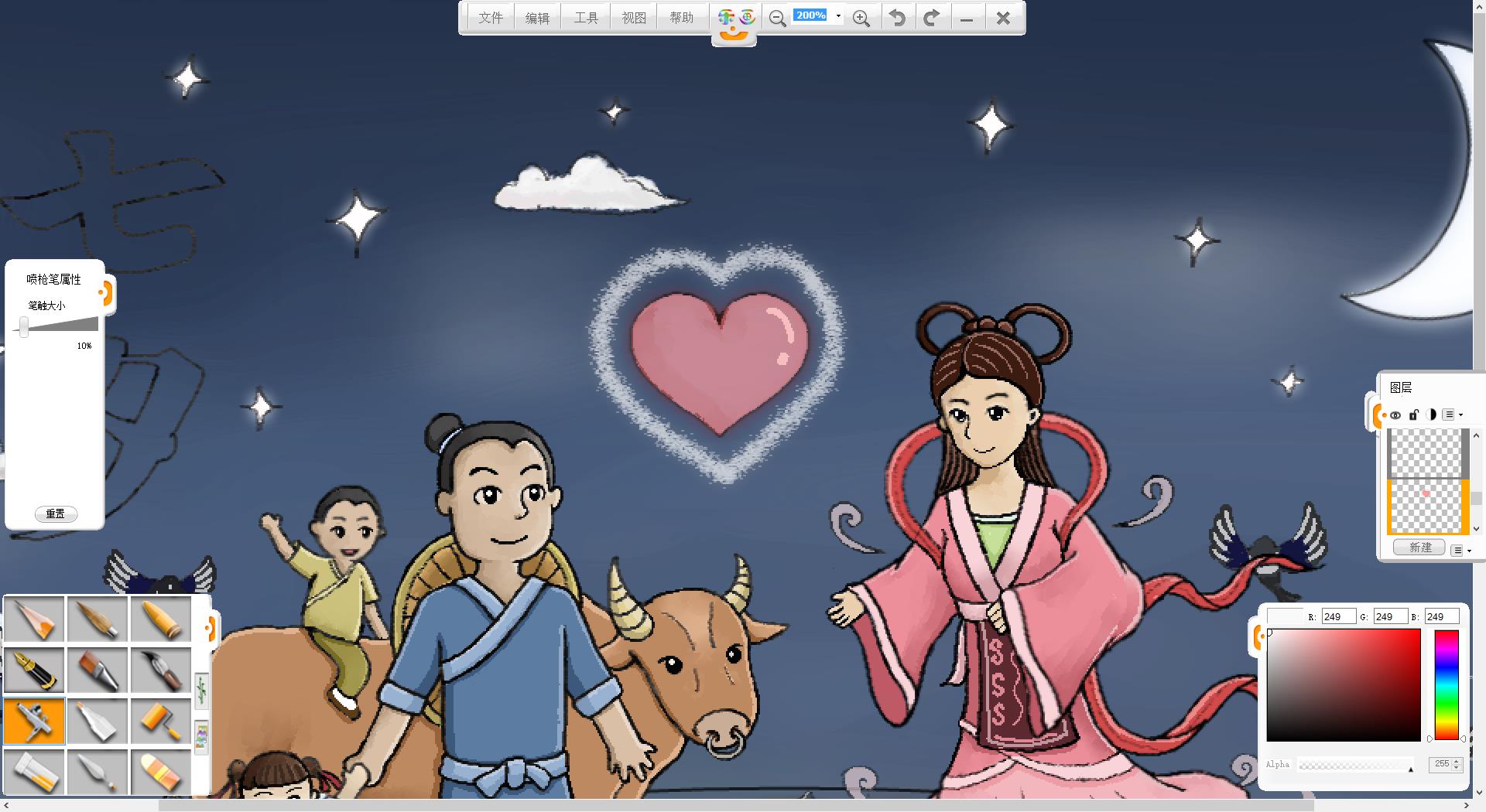 9.使用铅笔笔触在画面左上方书写“七夕”两个字。