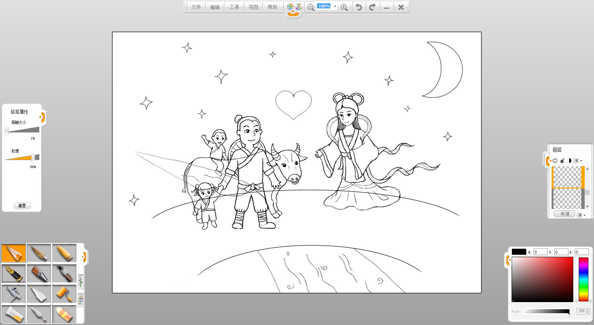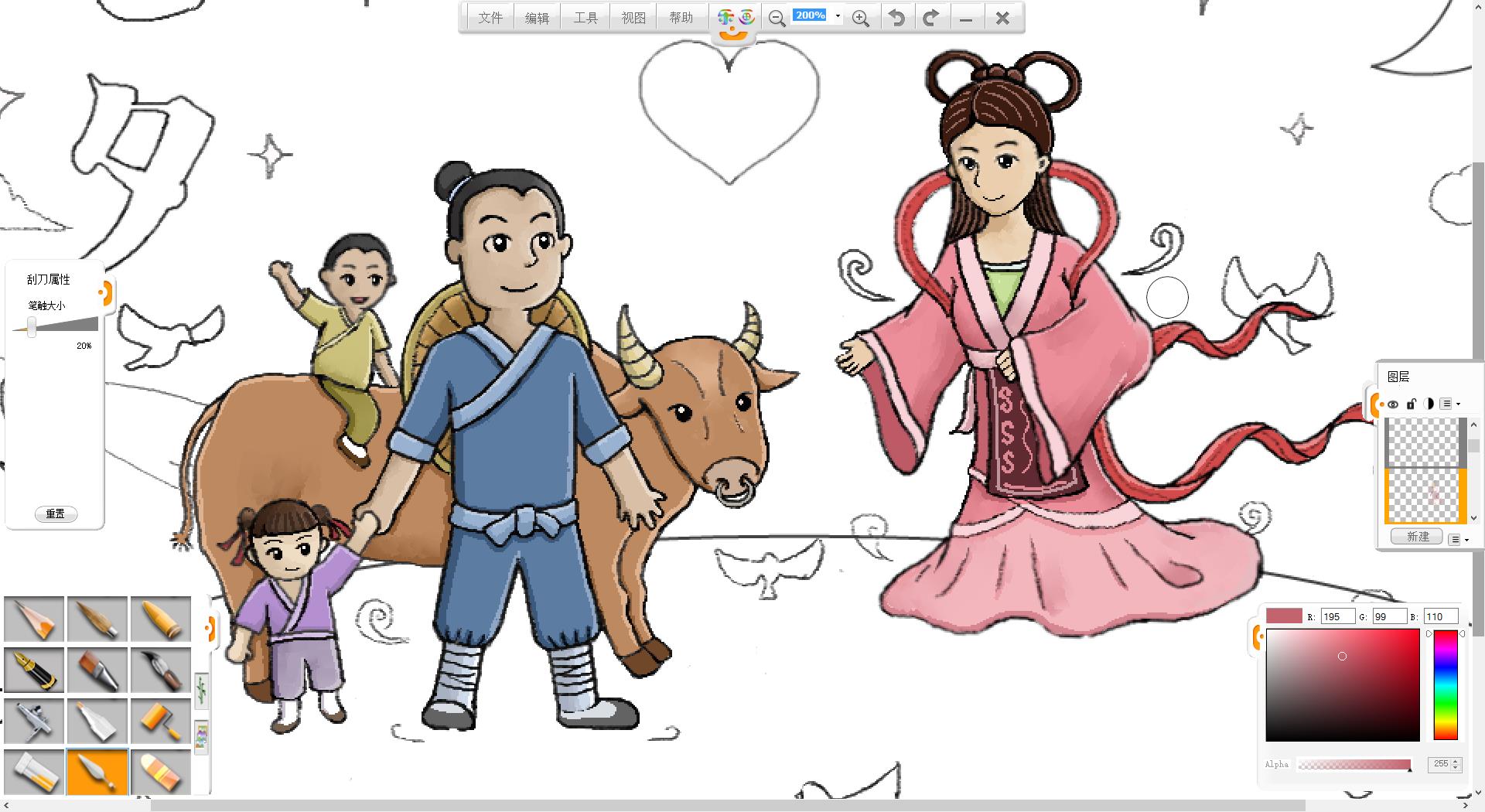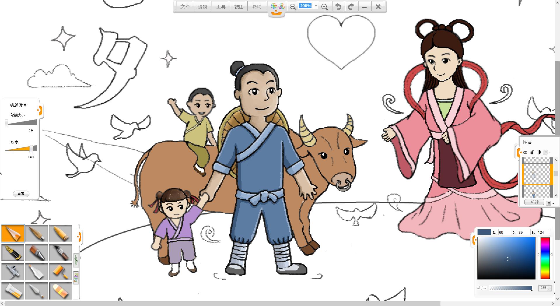 4.在画面左侧使用铅笔笔触绘制一个牵着女儿的牛郎形象。