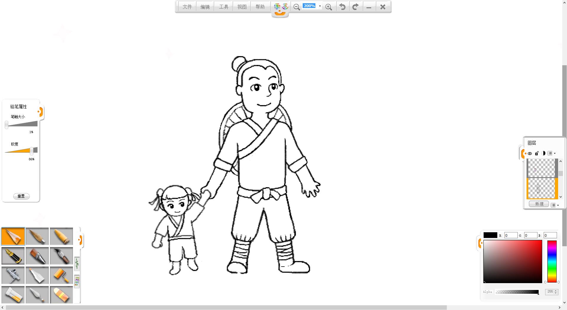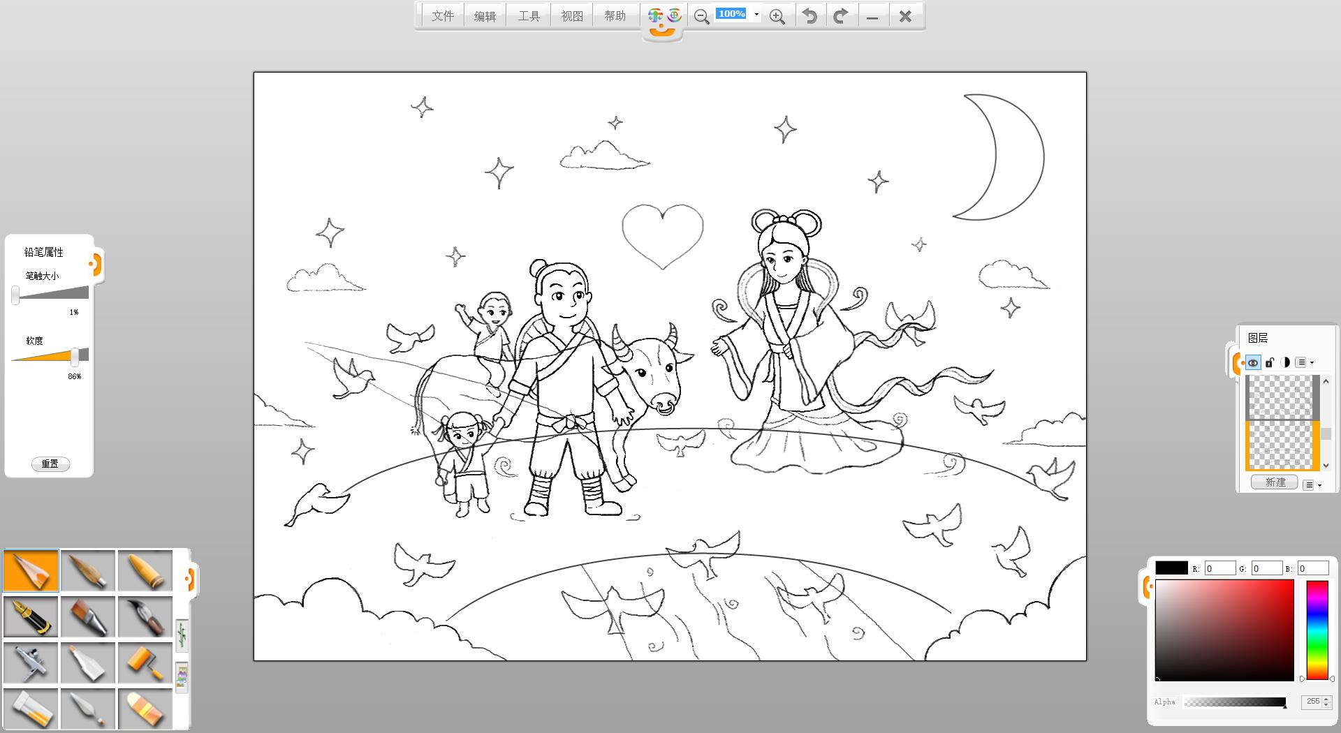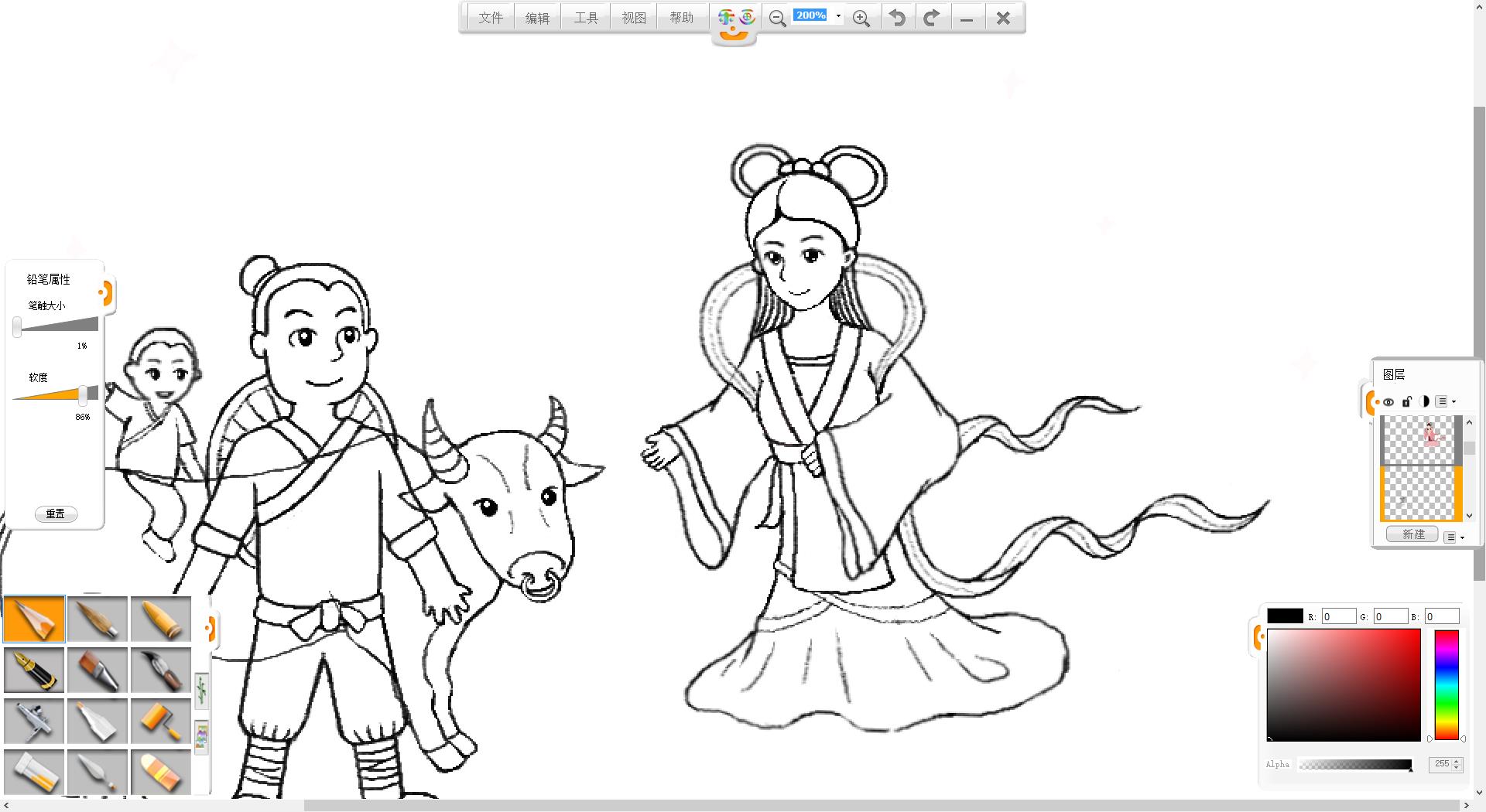 4.在画面左侧使用铅笔笔触绘制一个牵着女儿的牛郎形象。