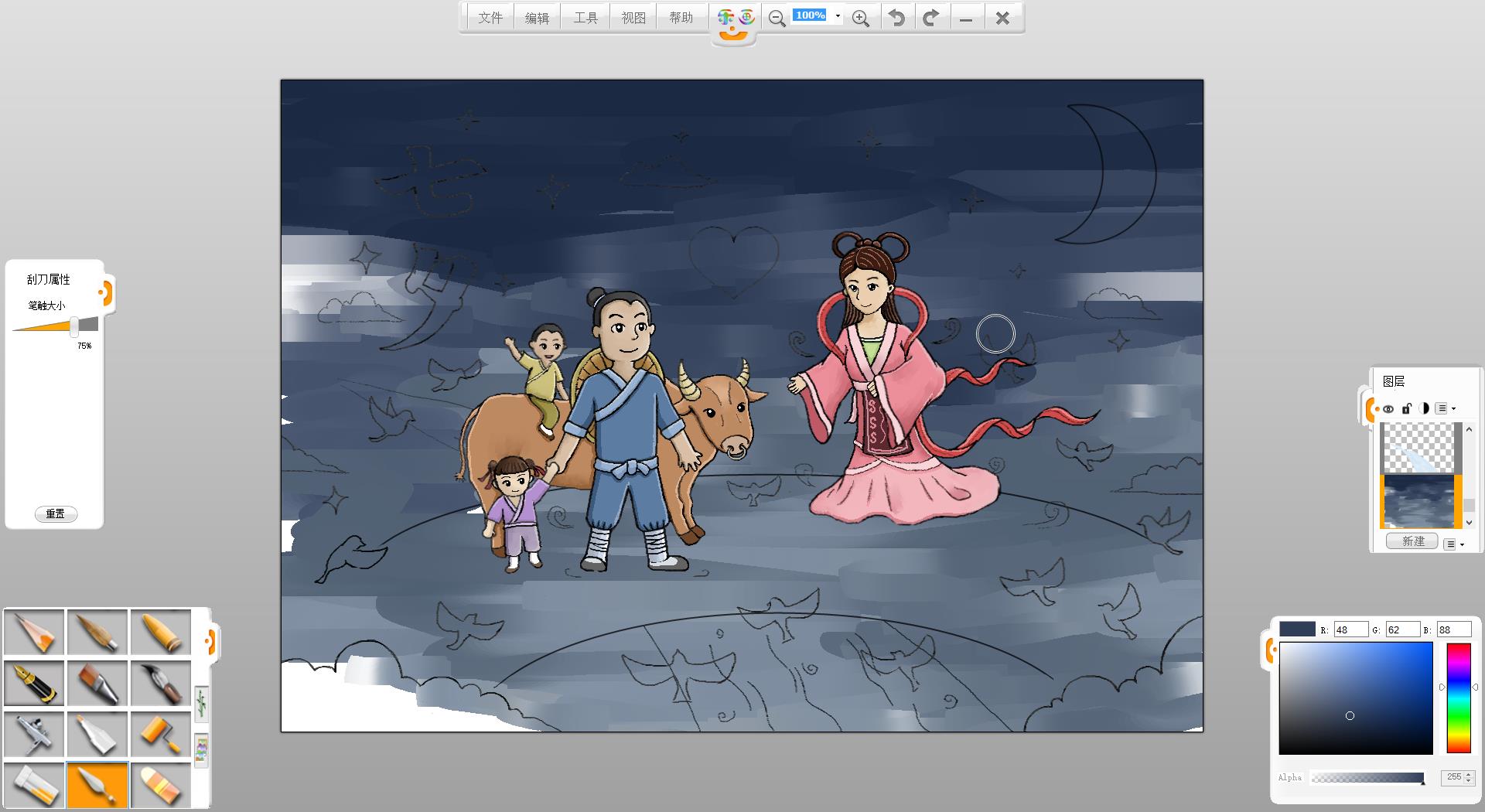 13.使用铅笔笔触和刮刀笔触为牛郎添加阴影和细节。