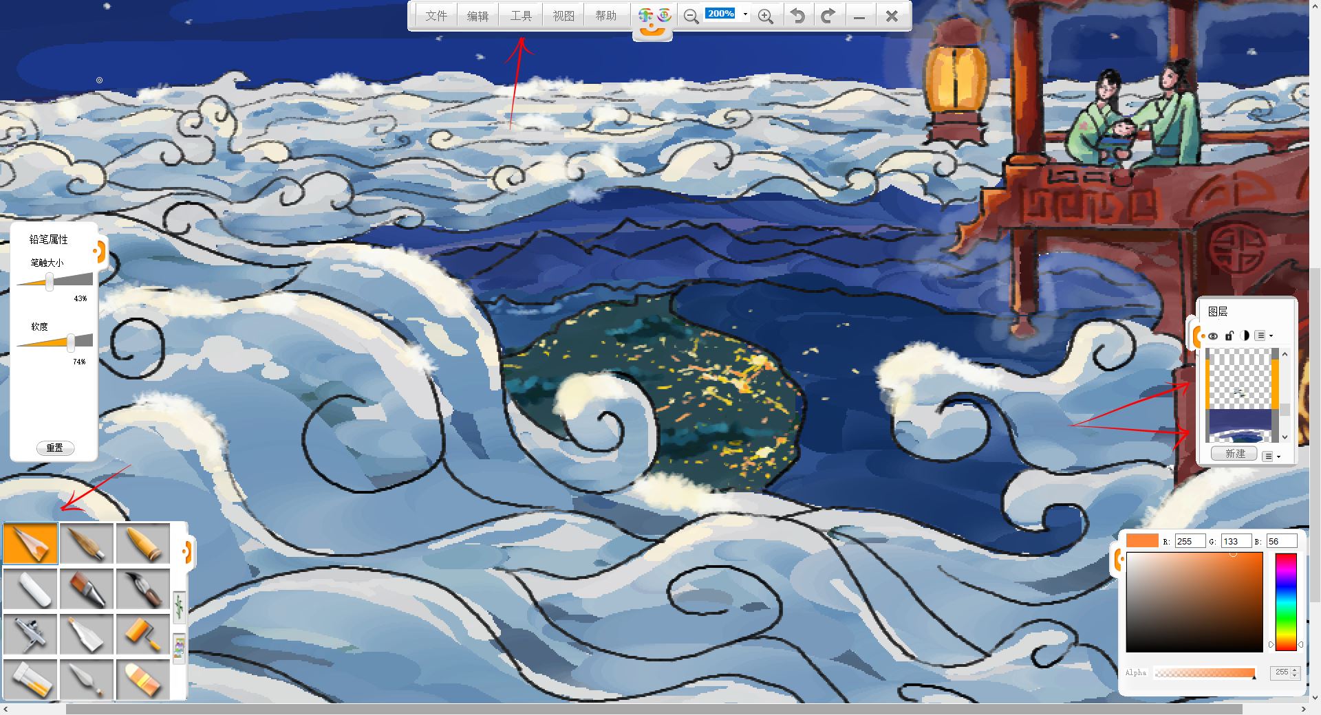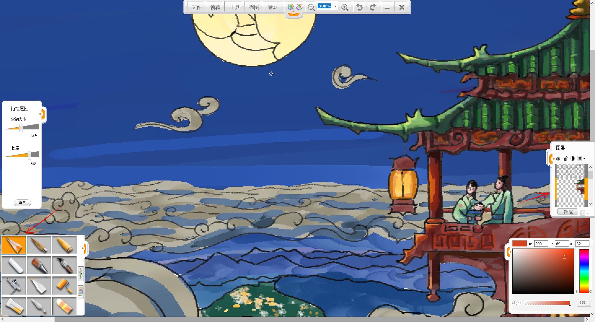 12.用“工具”-“调整”-“色相/饱和度”调整工具,调整云暗面图层的色相,使其更符合环境色。然后合并楼宇,人物图层,使用铅笔工具,刻画建筑图案和阴影等细节,对着月亮和灯笼的一面偏亮,背着的一面偏暗,线稿也可以稍作调整。
