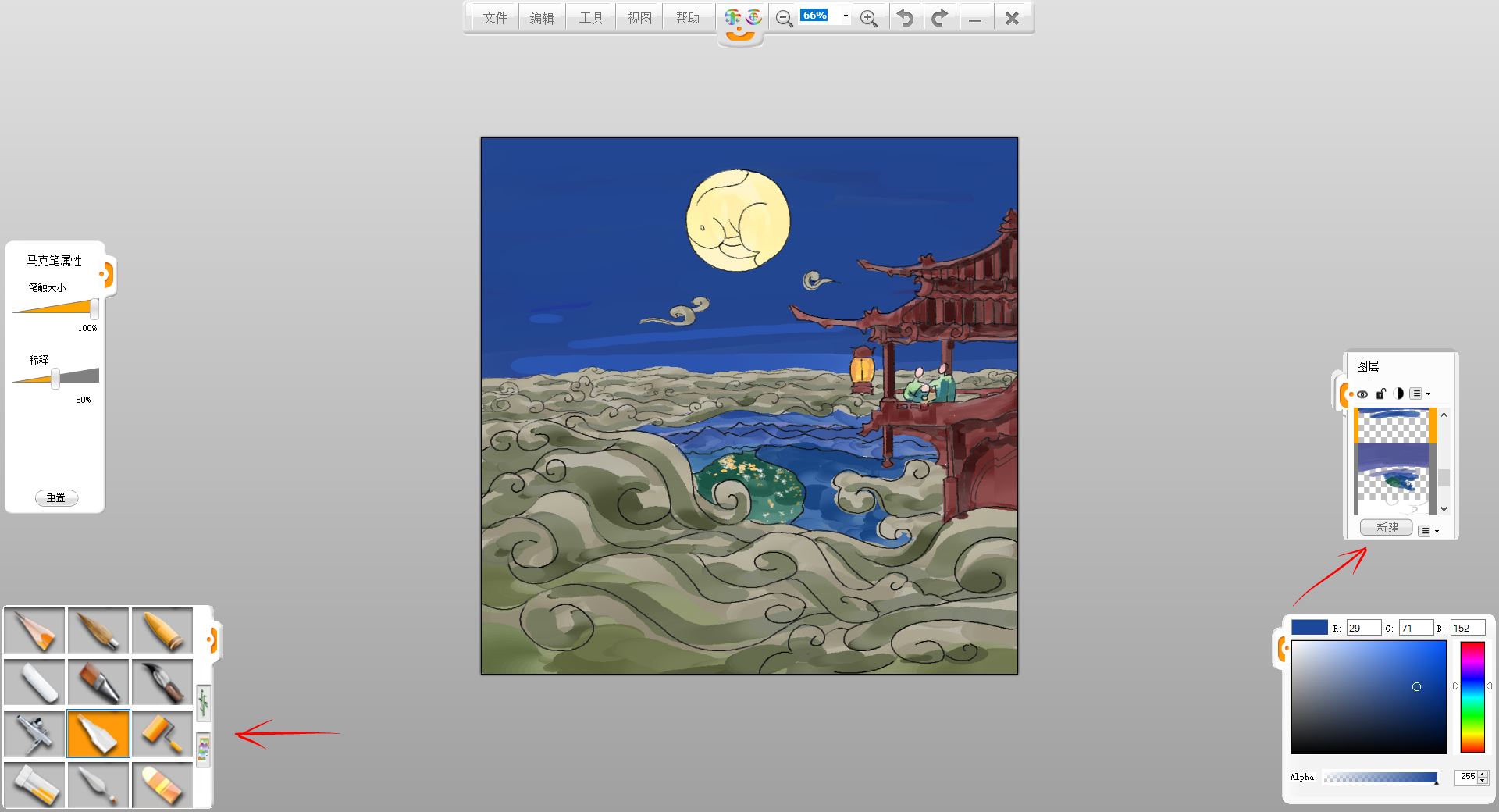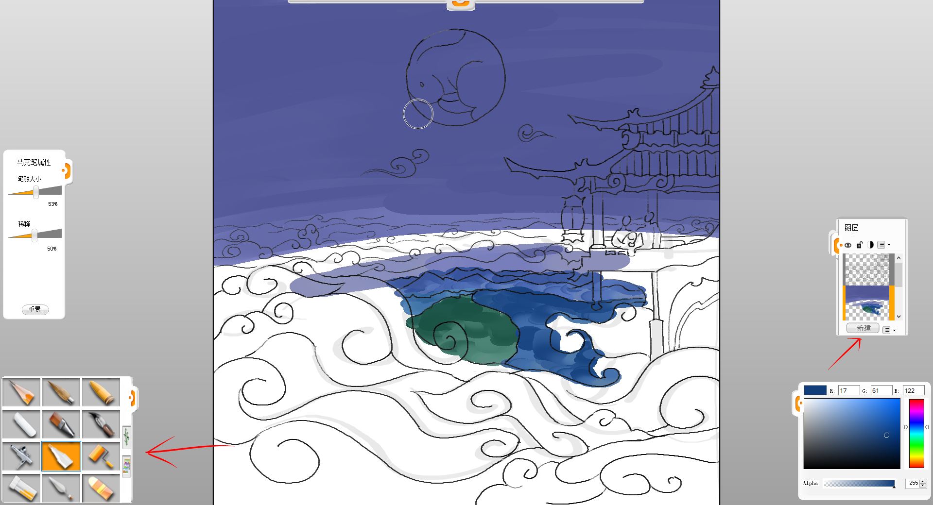 10.新建一个图层,用马克笔笔触给小楼和赏月的一家三口简单铺色。