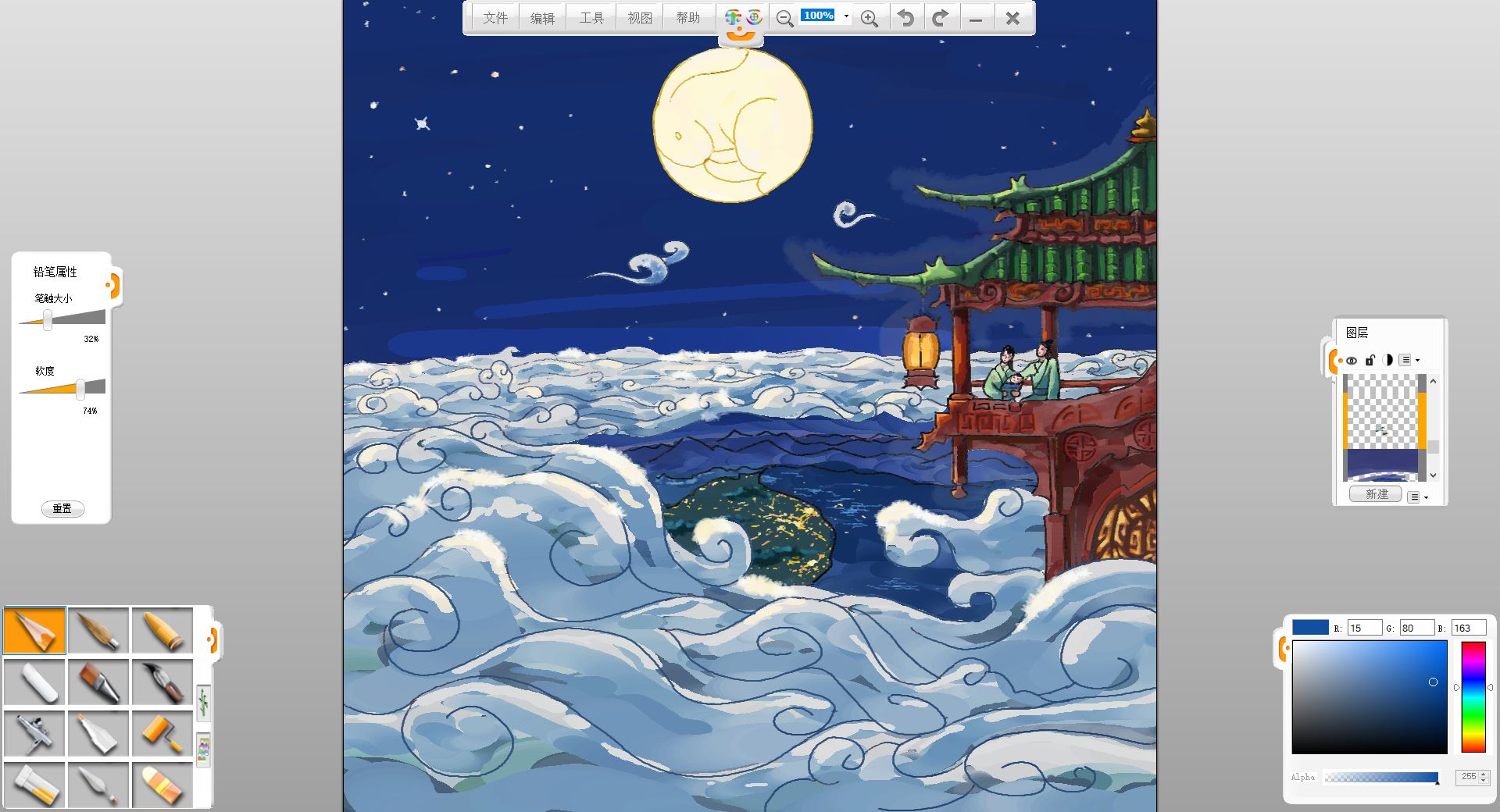 19. 最后润色调整些细节,擦掉一些边边角角没画好的,这样一幅中秋琼宇赏月图就完成了。