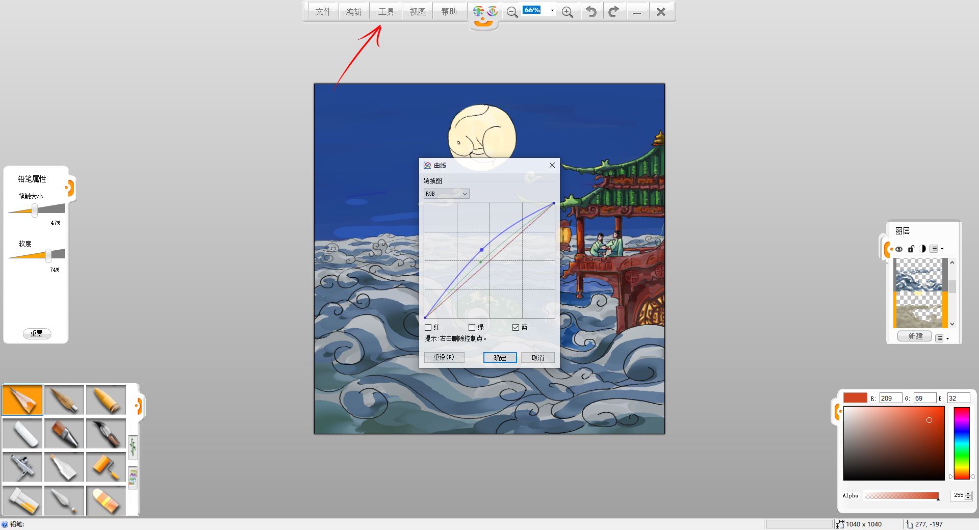 13.使用“工具”-“调整”-“曲线”调整工具,给云层调色,之前偏绿,而夜晚的云层应该偏蓝色,选中云层图层,这里可以用曲线调整工具调整亮度和色相。
