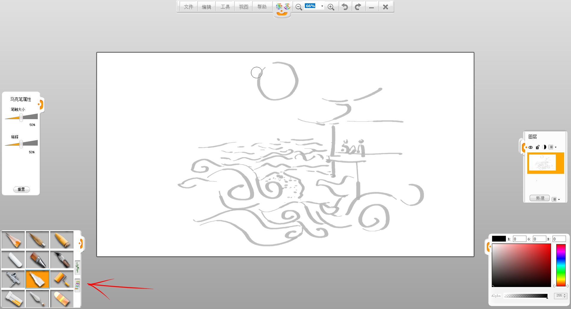 3.使用画笔栏的马克笔笔触,把心中的画面用单一颜色概略的画出,确定大概构图,这一步骤画的草图最后不显示,所以不用很精致。