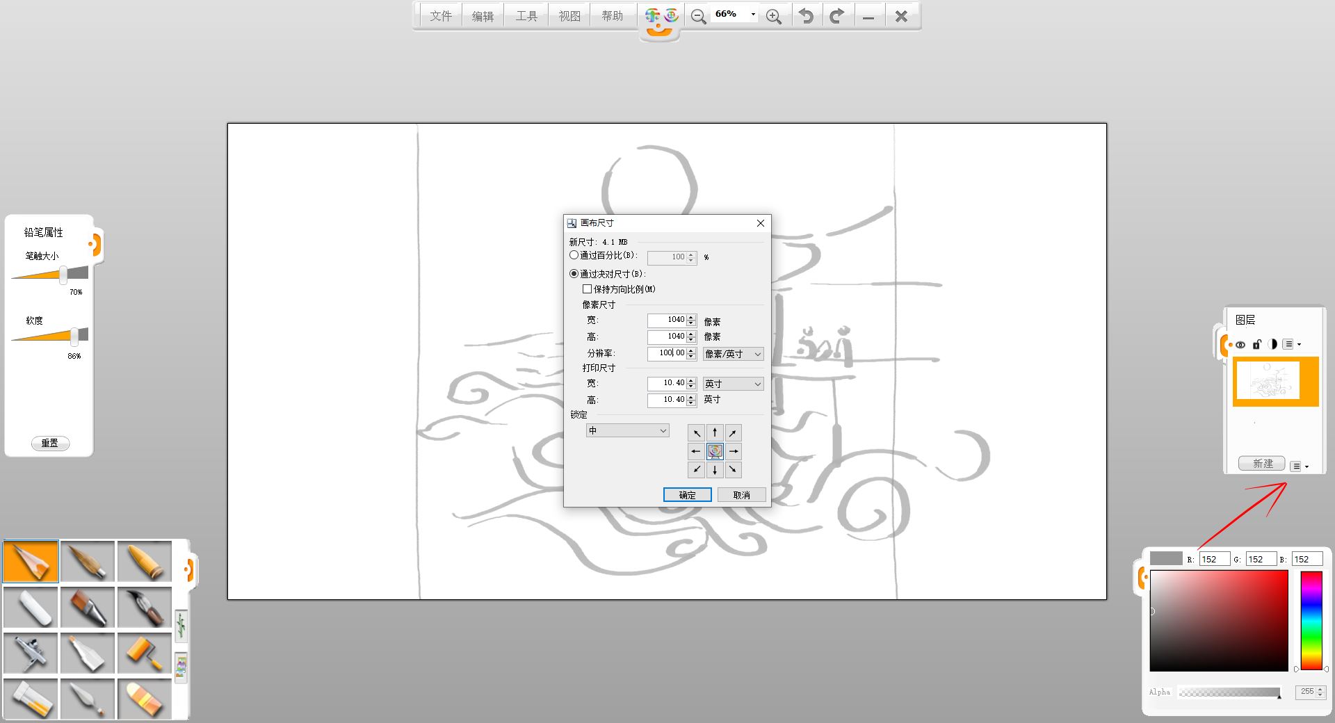4.点击箭头所指功能模块,选择重新设置画布尺寸,估算好草稿的外轮廓范围,在弹出栏修改画布参数,设置为一块正方形画卷。