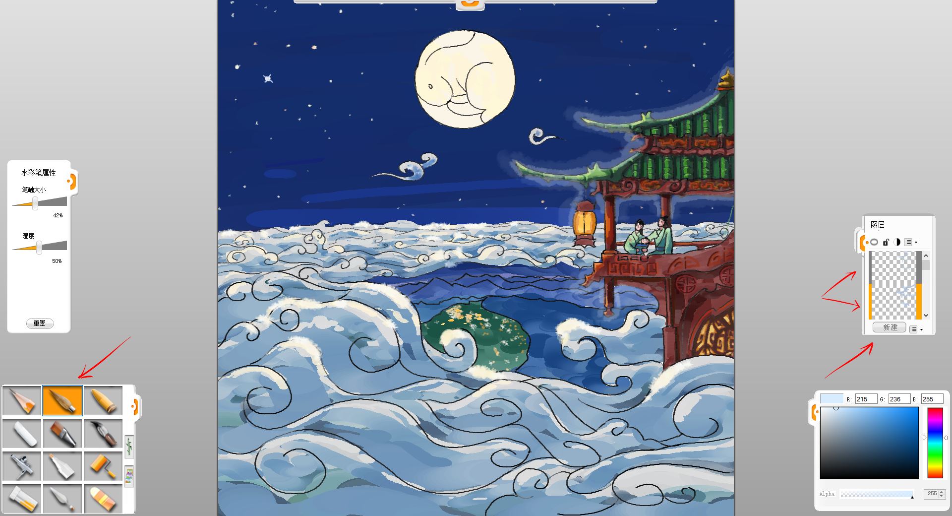 中秋节是中国传统节日之一,有着悠久的历史和丰富的诗词歌赋,现在一起创作一幅神仙也赏月的图吧!