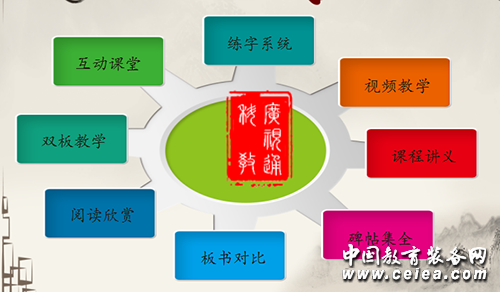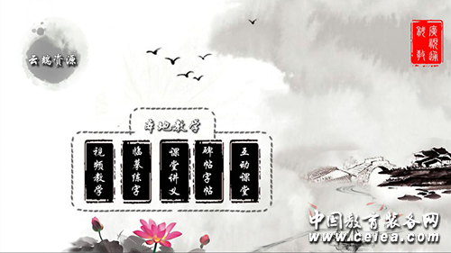 数字书法云系统常用的六大系统:视频教学、课堂讲义、互动课堂、临摹练字、碑帖字贴、以及云端资源。