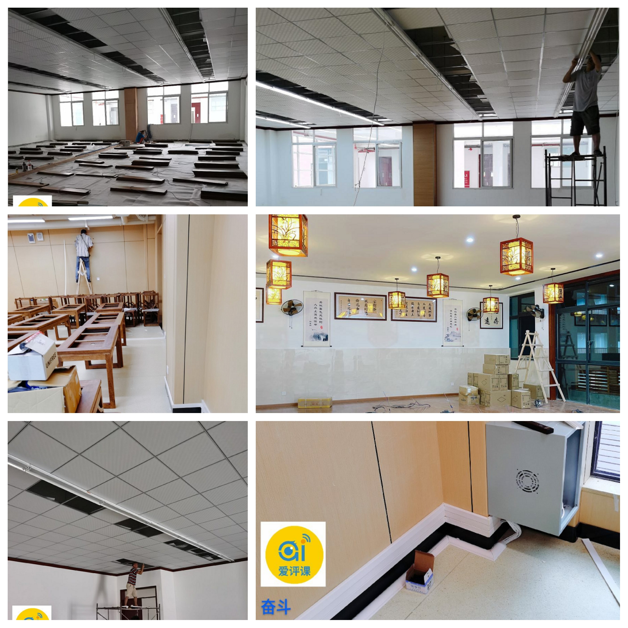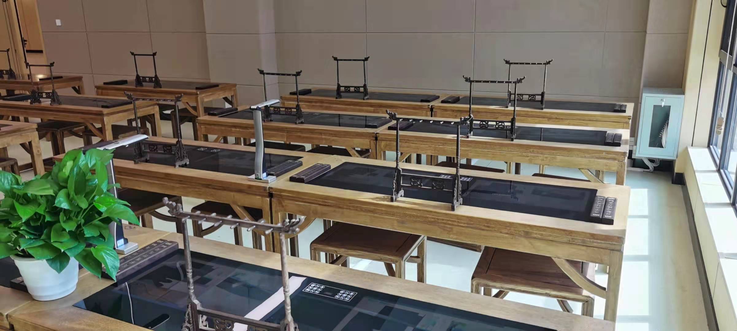 教室布局、开槽网线弱电、吊顶、灯具、老师示范设备、学生临摹屏、互动主控设备、厚重的实木中国风桌椅,夹水晶头、每根网线、座位临摹屏、学生终端、笔洗笔挂,都凝聚了施工同事的责任和坚守。