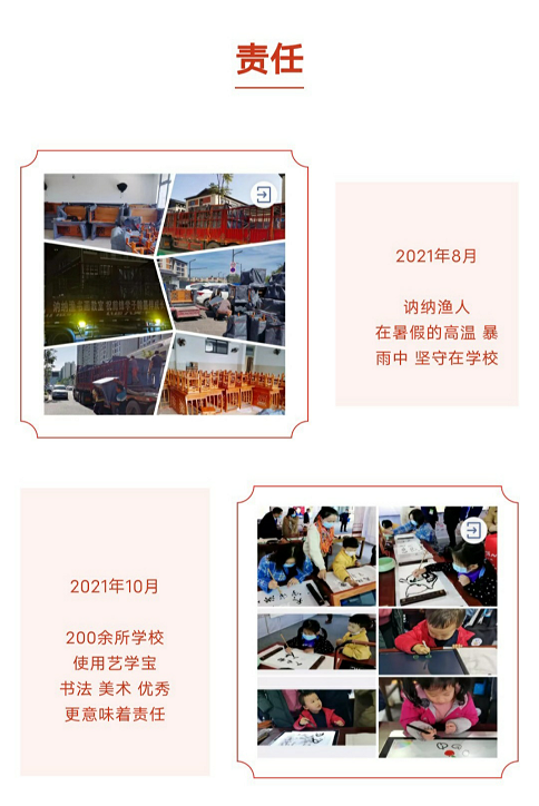 拥有自主开发的系列产品,涉及中国传统文化书画教室、老师成长和提升的教研产品、增赋减负备授课工具、提升优质资源均衡的结对课堂。自主研发产品:课堂评价-爱评课、美术教络系统-艺学宝、数字临摹书法教室-艺学宝、互动结对课堂、名师专递课堂。配套硬件产品:艺板绘画屏、艺学宝书法临摹全贴合屏,产品优势:数据采集与运用、互联网+等创新运用在教学和教研,助力英音美薄弱学科的师资水平提升和名师课堂发挥普惠作用。